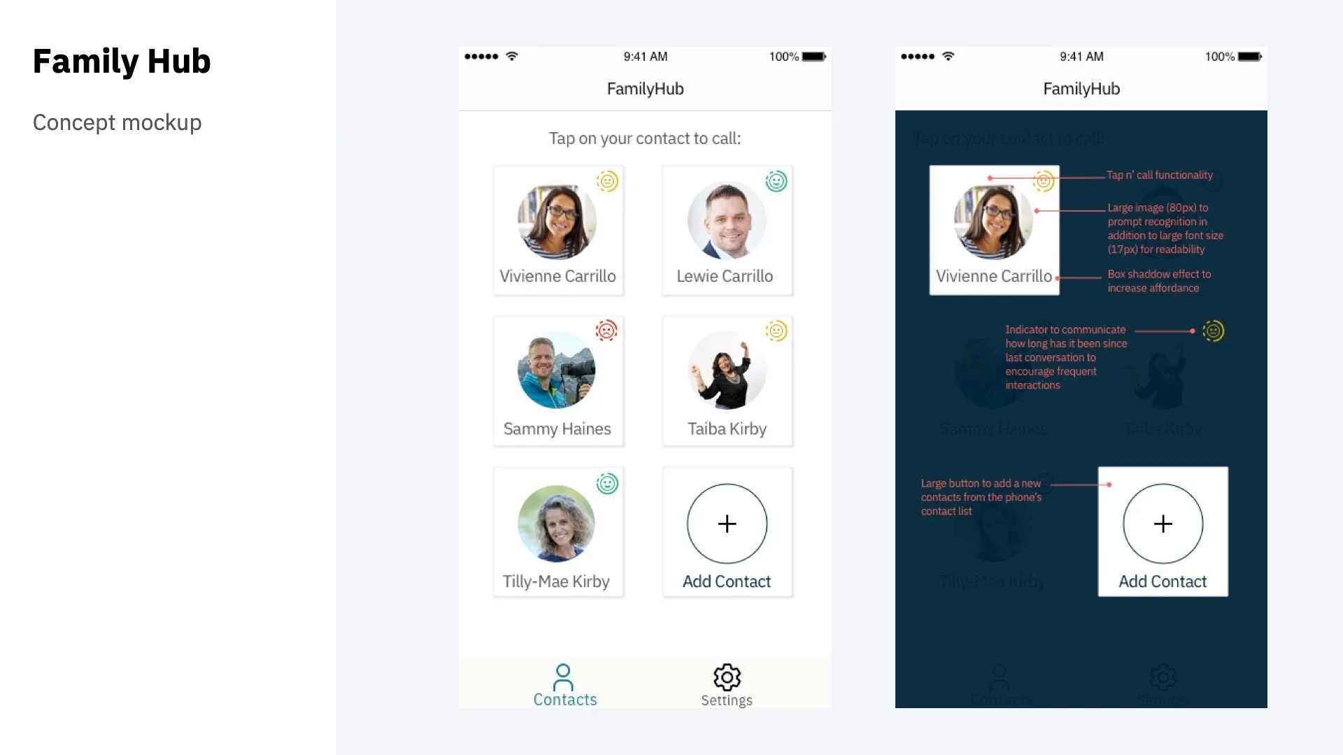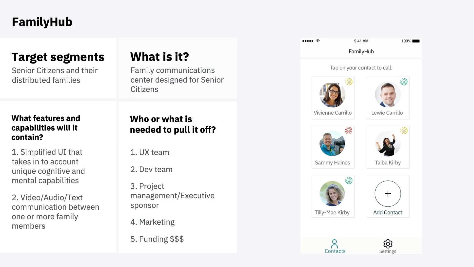 FamilyHub is a radically simplified communications center for senior citizens with cognitive, mental, or mobility challenges to stay connected with their distributed families and receive greater support.