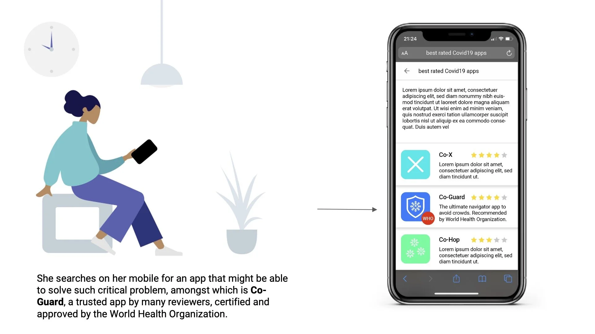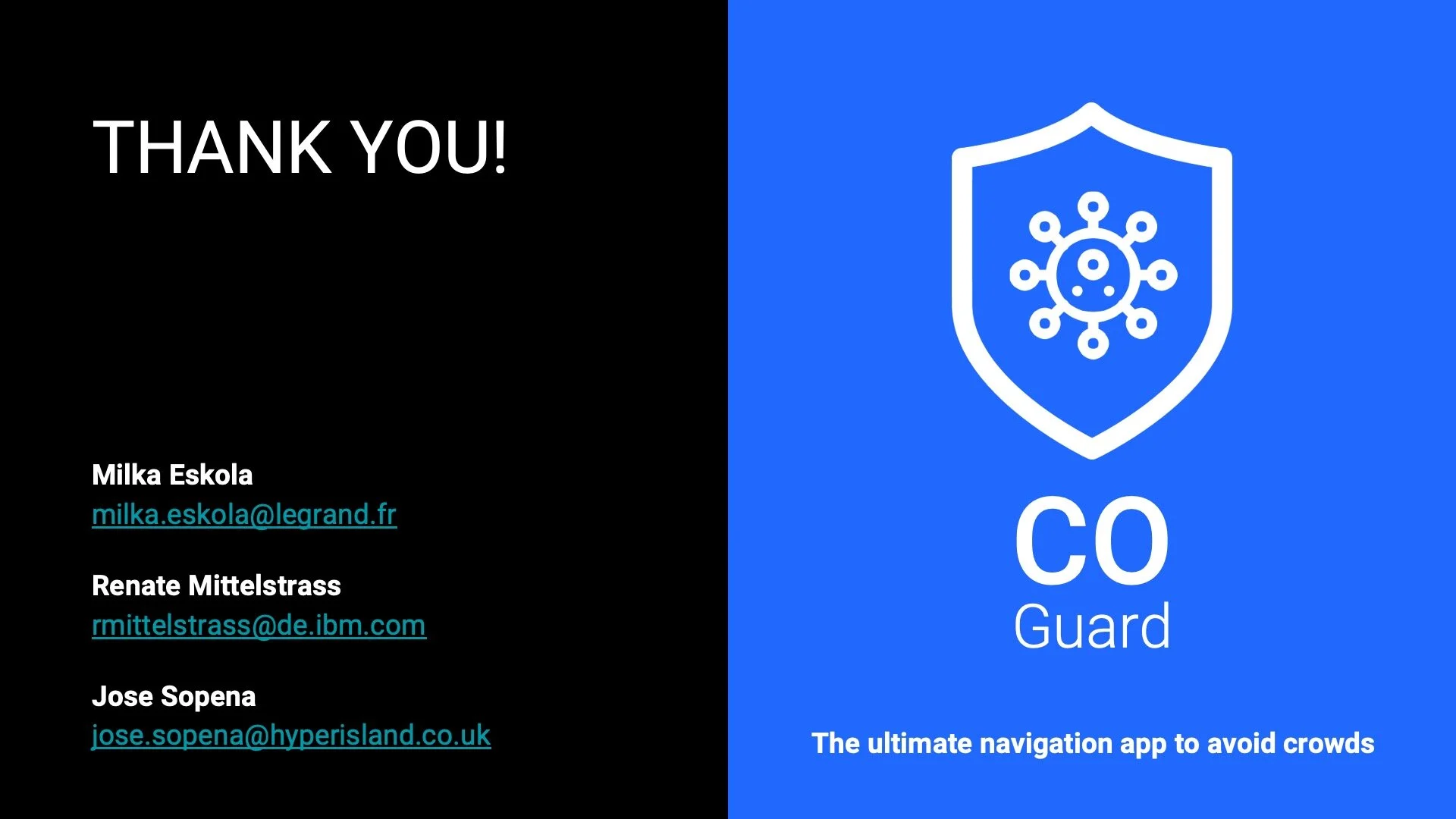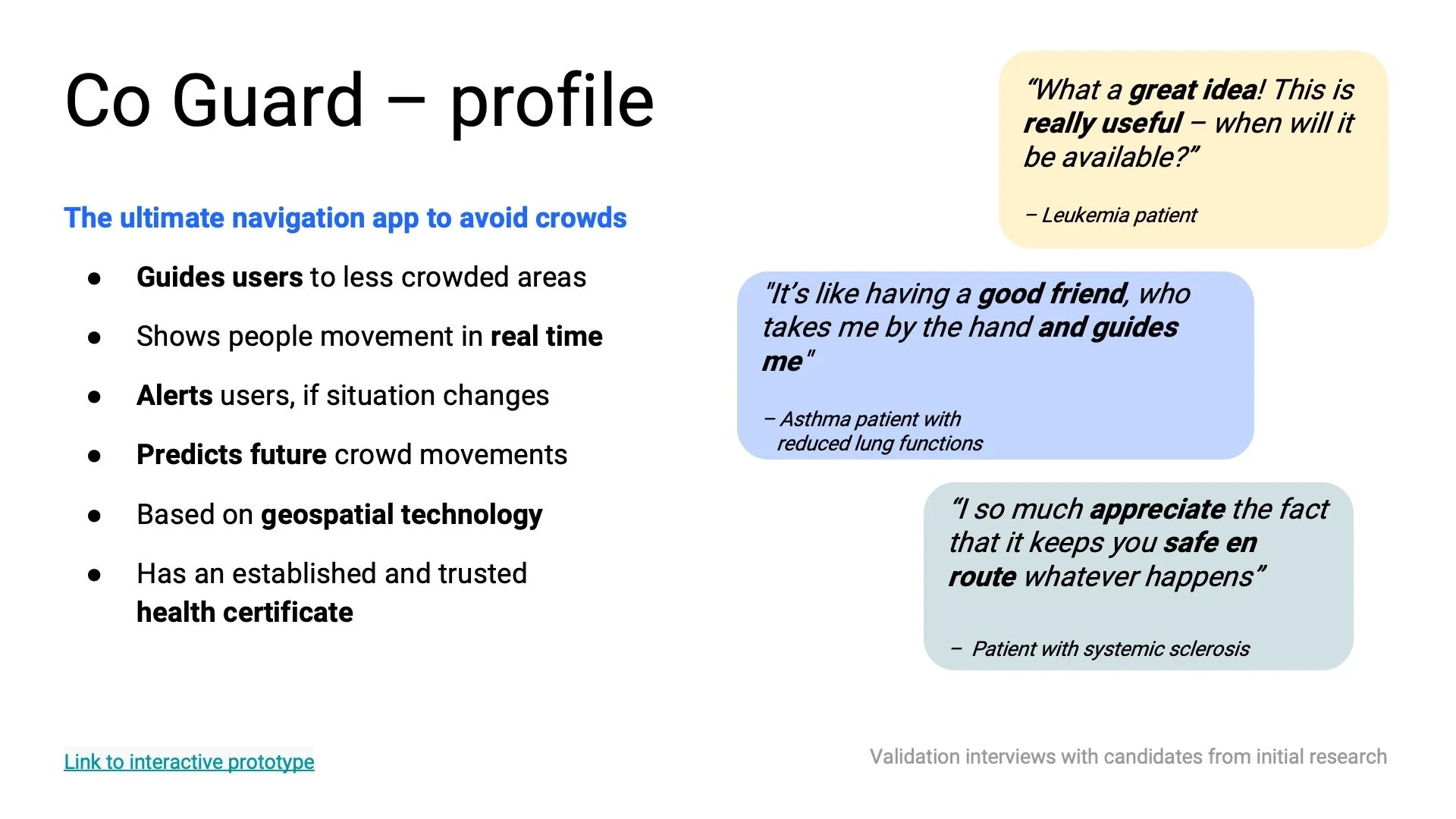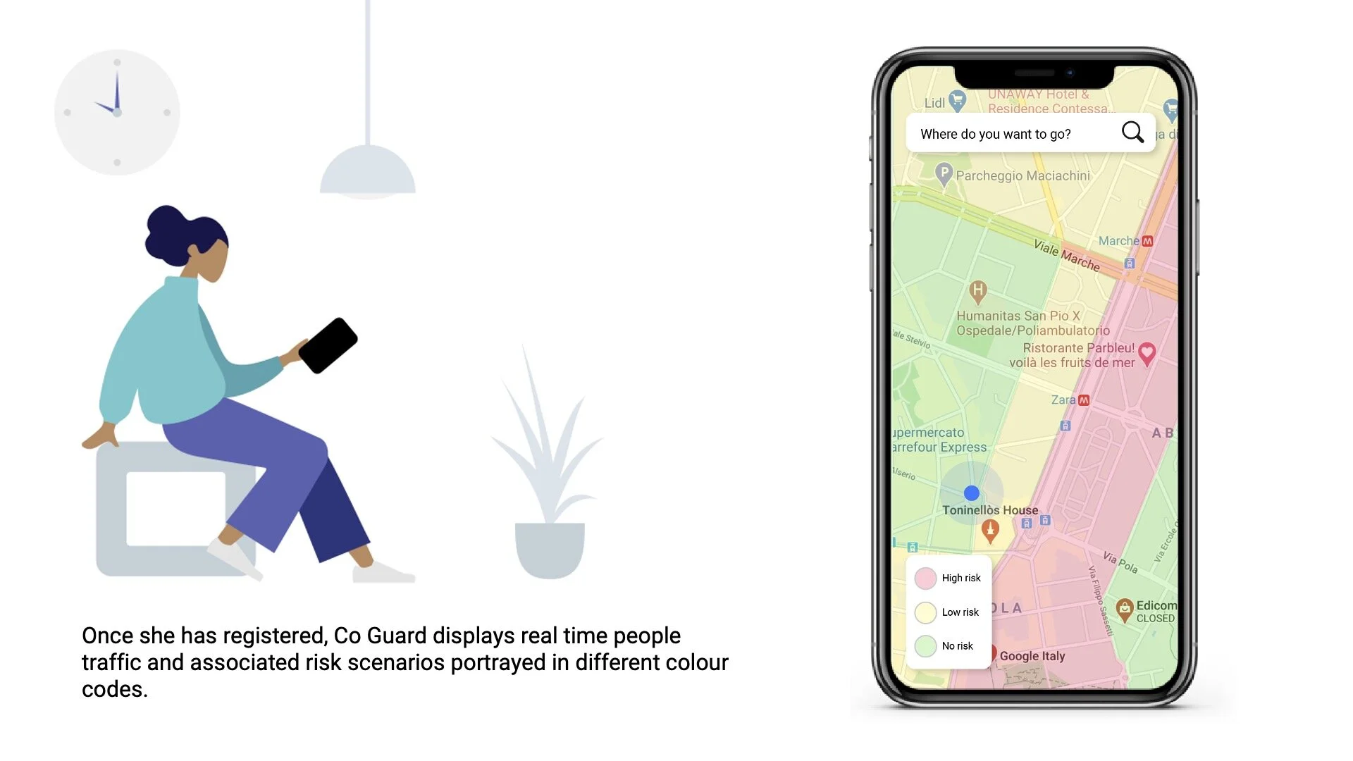 Co Guard is a navigation app that helps people avoid potentially dangerous crowds. By using geospatial technology and predictions, users can see real-time crowd movements and be guided to safer locations.